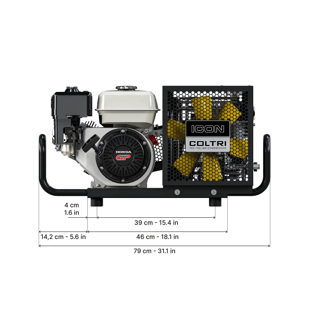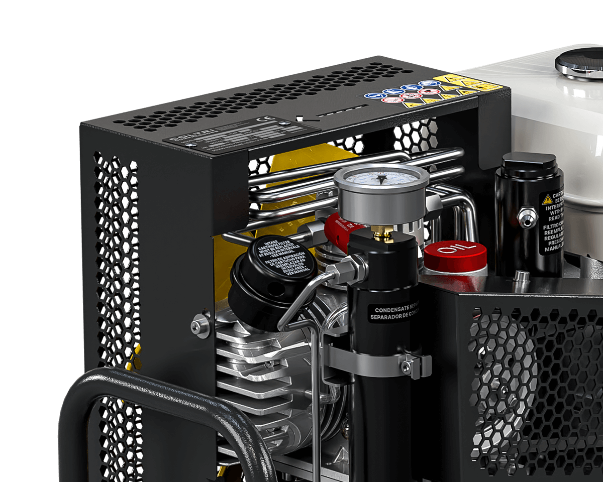 MOTOR : HONDA GX200 3.6 kW. CHARGING RATE : 100 L/MIN (6.0 M³/H, 3.5 CFM) FILLING TIME : 20 MINUTES WORKING PRESSURE : 330 BAR FINISH : STAINLESS STEEL