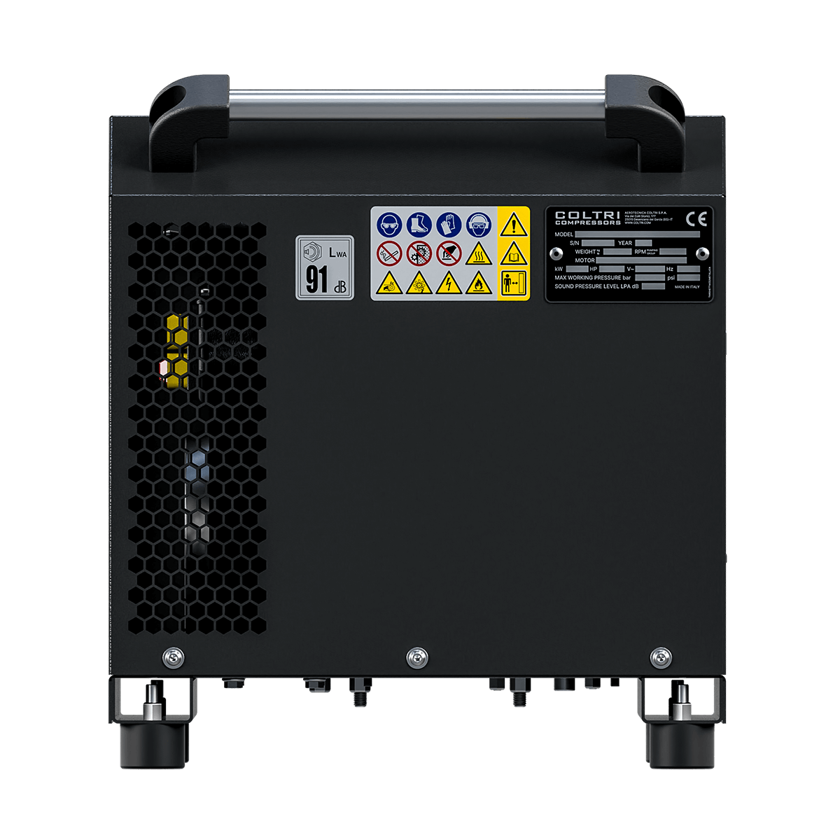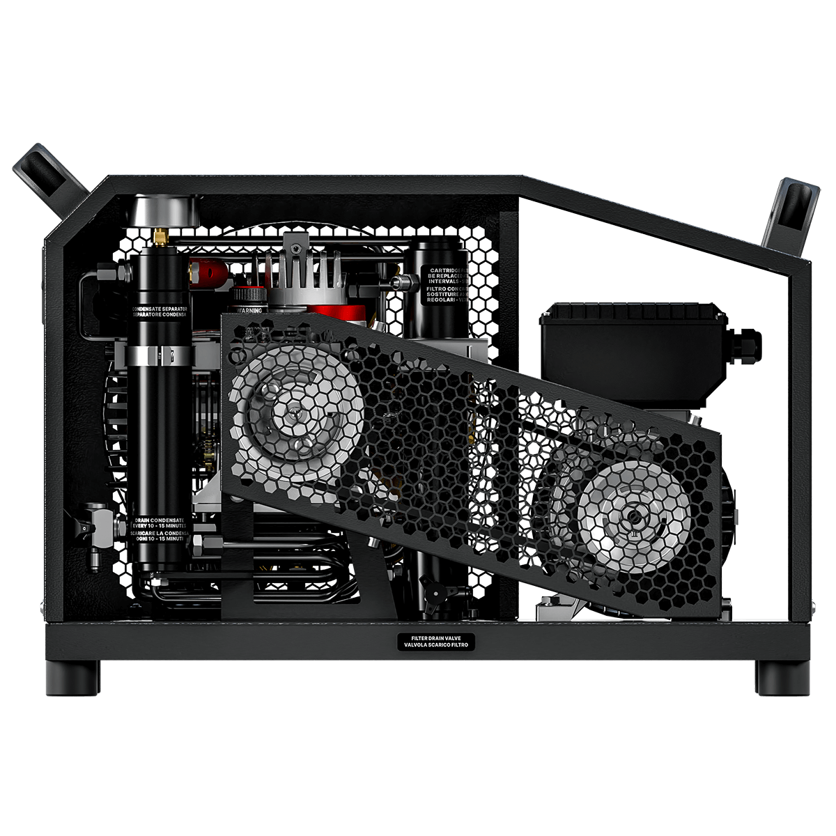 Three-phase 230V (60Hz), 3 kW. Charging rate: 100 L/min (6.0 m³/h, 3.5 CFM). Fill time: 20 minutes. Working pressure: 330 bar. Frame : Black